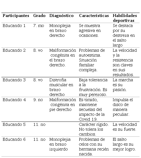 La presente intervención ha sido realizada para 6 educandos-atletas con edades que oscilan entre 12 y 16 años. Todos ellos están incluidos en el sistema de enseñanza deportiva, contando con el apoyo de un equipo de docentes (profesores de la escolaridad, entrenadores deportivos y sicopedagogos). La tabla 1 sintetiza los rasgos característicos de cada uno los educandos implicados. Todos practican modalidades del deporte Atletismo.