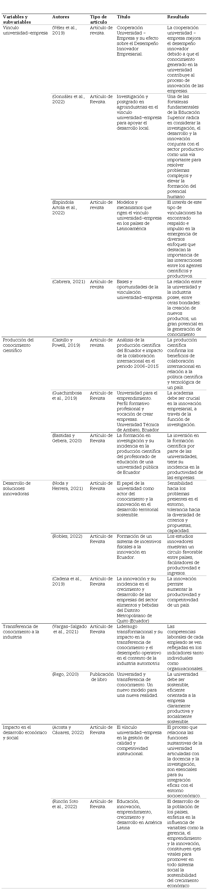 Para el análisis de los resultados de la revisión y teniendo en cuenta los criterios de inclusión y exclusión efectuados, se analizaron los criterios expuestos en los artículos por los diferentes autores, a partir de las dos variables principales. Variable independiente: el vínculo universidad-empresa y una variable dependiente: la producción del conocimiento científico; desagregándose subvariables como: desarrollo de soluciones innovadoras, transferencia de conocimiento a la industria e impacto en el desarrollo económico y social; de estas a su vez un grupo de subvariables que generan datos para enriquecer la investigación como: proyectos conjuntos de colaboración, programas de formación y prácticas, impacto en el mercado laboral, generación de nuevas ideas, aplicación práctica de investigación, formación de los estudiantes, desarrollo, formación. Variables que dieron respuestas a las preguntas de investigación, cumplieron con el objetivo propuesto y acertaron con el tema en cuestión: El vínculo universidad-empresa y su impacto en la producción del conocimiento científico (Ver Cuadro 2).
