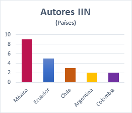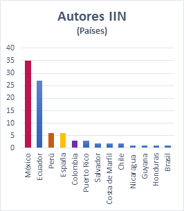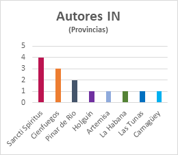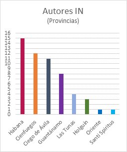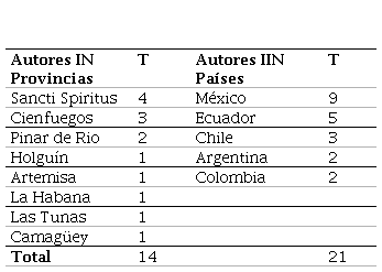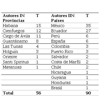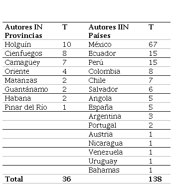 Igualmente, pueden apreciarse en la tabla 4 y en las figuras 1 y 2, la distribución de autores por provincias pertenecientes a instituciones nacionales, así como los autores de instituciones internacionales por países.