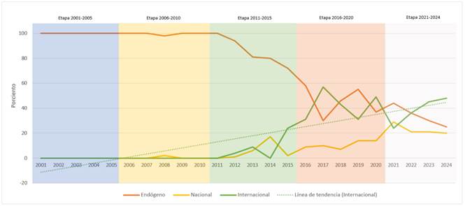 Por otra parte, una síntesis de la caracterización de los autores que publican sus resultados científicos en la revista durante todas las etapas consideradas, se puede observar en la figura 7, en la cual es evidente la disminución de los autores endógenos, así como el incremento de los autores nacionales e internacionales, cambios que se van dando de forma paulatina. Esto muestra cómo la difusión de conocimientos científicos por la revista, que en las dos primeras etapas eran eminentemente de carácter local, en el resto de las etapas va incrementando en otras provincias del país y en otros países, fundamentalmente de América latina y el Caribe.
