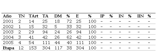 Independientemente de las limitaciones señaladas, el lector puede comparar la tabla 2 (que aparece a continuación), con la tabla 1 correspondiente a la etapa anterior y advertir como se aprecia una tendencia a la semejanza en los números por años, así como en la cantidad de artículos por números; de igual forma, la cantidad de autores oscila entre límites más cercanos, de igual forma que el número de doctores y masters. La revista aún en esta etapa no supera su condición de revista endógena.