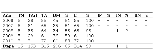 Por otra parte, la tabla 5 que aparece seguidamente muestran los datos referidos a la cantidad de números, artículos y autores correspondientes a la etapa, en la cual es de destacar el decrecimiento del número de autores endógenos y el incremento significativo de autores internacionales,