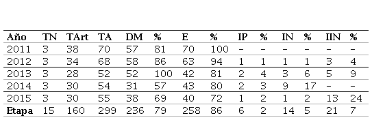 La tabla 1 muestra para cada año considerado en la etapa, los datos relacionados con el total de números publicados (TN), el total de artículos (TArt), y el total de autores (TA), así como la cantidad de autores según la categoría de Doctores y Máster, así como la cantidad de autores según el lugar de procedencia: endógenos o pertenecientes a la propia institución (E), de instituciones de la provincia (IP), de otras instituciones nacionales (IN) y de instituciones internacionales (IIN) señalándose en cada caso el porciento que representa con respecto el total de autores.