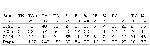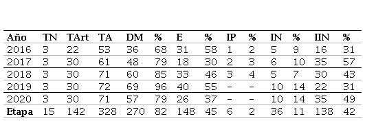 En general, en la etapa se cumplió con la salida de los tres números planificados para el año, pese a la compleja situación epidemiológica enfrentada en los primeros años; con respecto a la caracterización de autores, se advierte una continuidad respecto a la etapa anterior, del decrecimiento del número de endógenos y la elevación de los autores pertenecientes a instituciones extranjeras, lo cual puede apreciarse en la tabla 7.