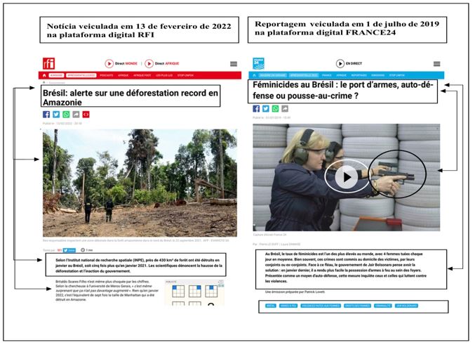 Apresentam-se aqui, a título de ilustração, o extrato de uma notícia e de uma reportagem que integram a seleção de enunciados para as atividades de leitura em FLE. O primeiro enunciado diz respeito a uma notícia veiculada no site francófono de informações RFI em 13 de fevereiro de 2022, sob o título: Brésil: alerte sur une déforestation record en Amazonie2. O segundo é uma reportagem veiculada em 1 de julho de 2019 no site de informações francófono France 2, de autoria de Pierre Le Duff e Laura Damase (2019), que tem como título: Féminicides au Brésil: le port d’armes, auto-défense ou pousse-au-crime?3.