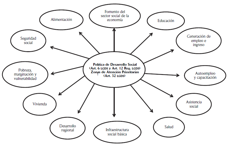 La orientación de la LGDS es establecer concurrencias, responsabilidades y, sobre todo, facilitar la coordinación entre los tres ámbitos de gobierno en aras de contribuir a un efectivo desarrollo social. Para el desarrollo social es sumamente trascendental dejar en claro cuáles son los aspectos comprendidos como fundamentales para lograrlo. En correspondencia, el artículo 6 señala: “Son derechos para el desarrollo social, la educación, la salud, la alimentación, la vivienda, el disfrute de un medio ambiente sano, el trabajo y la seguridad social y los relativos a la no discriminación en los términos de la Constitución Política de los Estados Unidos Mexicanos” (figura 1).