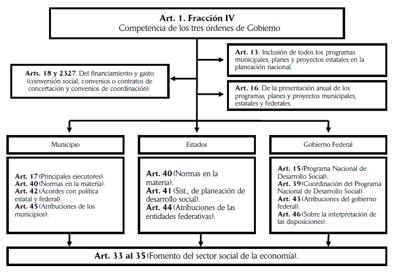 Buena parte de las generalidades planteadas por la constitución y el PND en lo referente al sistema de planeación se detalla en mayor medida en la LGDS. En consecuencia, en su primer artículo, fracción III, señala que la prioridad es establecer un Sistema Nacional de Desarrollo Social en el que participen los gobiernos municipales, las entidades federativas (equivalentes a las provincias sudamericanas) y la federación. En adición, en el mismo artículo 1.º, fracción IV, se determinan las competencias de los gobiernos municipales, de las entidades federativas y del Gobierno Federal en materia de desarrollo social, así como las bases para la concertación de acciones con los sectores social y privado.