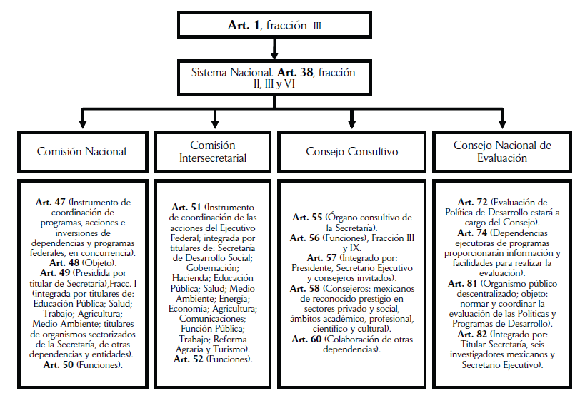 En el marco del federalismo y los procesos de nuevas formas de gobernar, impulsa la desconcentración y descentralización de los recursos y acciones para el desarrollo social, la transparencia y rendición de cuentas. La coordinación del Sistema Nacional estará a cargo de la Secretaría de Desarrollo Social. Lo conformarán los siguientes órganos: la Comisión Nacional, la Comisión Intersecretarial (conformada por representantes de diversas secretarías federales), el Consejo Consultivo (conformado por ciudadanos de reconocido prestigio en los sectores privado y social) y el Consejo Nacional de Evaluación de la Política de Desarrollo Social (integrado por seis investigadores académicos y tienen la finalidad de evaluar los diversos programas de la política social). El artículo 47 establece que la Comisión Nacional se encargará de coordinar que los objetivos, las estrategias y las prioridades de la Política Nacional de Desarrollo Social se pueden llevar a cabo desde el ámbito de competencia de los órdenes de gobierno, o bien en concurrencia entre ellos o incluso en concertación con los sectores social y privado.