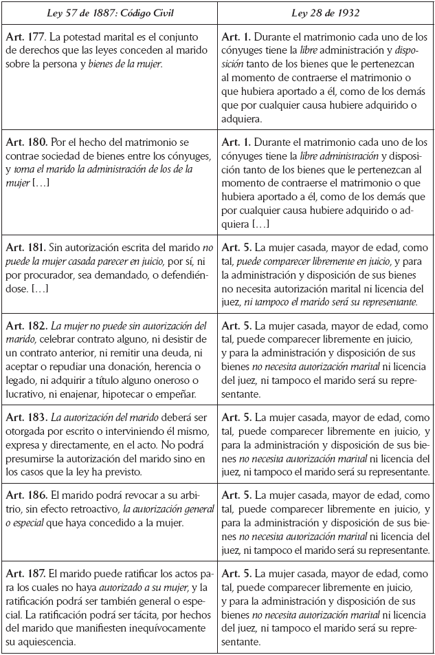 Con la promulgación de la Ley 28 de 1932 la situación jurídica de la mujer casada y mayor de edad cambió. La ley le confirió a esta la plena capacidad civil, judicial y extrajudicial que le permitió disponer y administrar libremente de todos los bienes matrimoniales o, por lo menos, de los de su propiedad. Se le quitó así al esposo la autoridad absoluta sobre el patrimonio que ambos esposos aportaban al matrimonio o que adquirían como fruto de su trabajo durante este e intentó equilibrar de esta forma la distribución de poderes tan desproporcionada que existía entre los cónyuges dentro del matrimonio.1