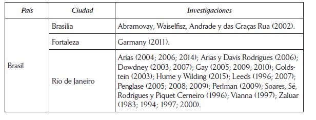 Tal vez más que cualquier otro país de América Latina, Brasil ha sido la cuna intelectual de estudios de la violencia urbana y la exclusión. En los últimos años, las pandillas se han convertido en tema de interés, no por ser un asunto reciente. Alba Zaluar (1983; 1994) ya había cimentado las bases para la mayoría de investigaciones acerca de este fenómeno en ese país (Abramovay et al., 2002; Adorno et al., 1998; Arias, 2004; 2006; 2014; Barker, 2005; Dowdney, 2007; Gay, 2005; 2009; 2010; Goldstein, 2003; Leeds, 1996; Penglase, 2005; 2008; 2009; Perlman, 2010; Soares et al., 1996; Vianna, 1997). Gran parte de esta literatura tiende a enfocarse en las pandillas de Río de Janeiro, porque es un destino atractivo para investigadores internacionales y también porque es un centro internacional de respuestas gubernamentales y no gubernamentales hacia problemas de violencia de pandillas, canalizada por organizaciones como Viva Rio y Promundo.8 Sin embargo, existe una corriente emergente enfocada a explorar la violencia en otras ciudades como São Paulo (Denyer Willis, 2009; 2014; 2015; Holston, 2008), Fortaleza (Garmany, 2011) y Pernambuco (Scheper-Hughes, 2015), aunque solo una pequeña porción está centrada en las pandillas.