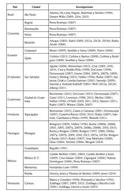 Nuestro conocimiento acerca de las pandillas, los traficantes de drogas y el crimen organizado es bastante inconsistente y, a menudo, contradictorio; por eso, este artículo tiene como objetivo brindar una visión general acerca de este asunto.2 Ofrece una revisión de la literatura publicada fundada en estudios empíricos primarios, porque, pese a que existen buenos estudios basados en fuentes secundarias, la mayoría suele ser sensacionalista, con motivaciones políticas, especulativa y, en ocasiones, errada.3 Comenzaremos enfocándonos en las dos literaturas más desarrolladas hasta el momento en Centroamérica y Brasil, así como en la literatura emergente en otros países de la región (tabla 1). A continuación, identificaremos la continuidad de temáticas transversales importantes entre estudios y varias temáticas emergentes y concluiremos con una agenda tentativa para futuras investigaciones.