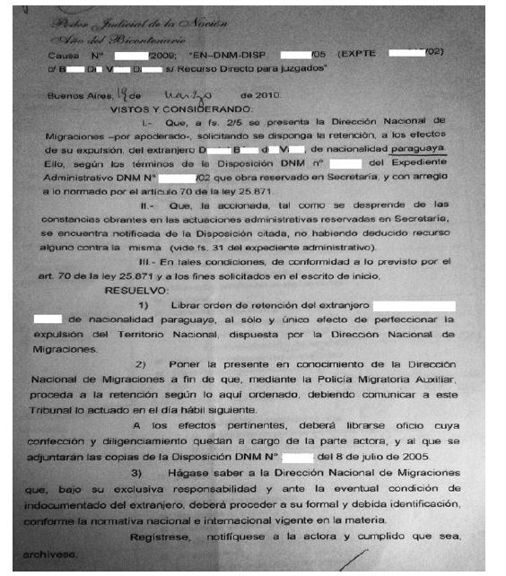 En suma, el trámite de estas retenciones suele ser muy corto y consta de unas tres partes: la DNM solicita la retención, el tribunal emite una primera resolución formal en donde invita a la DNM a adjuntar la documentación que avala su pedido (algo usual y que tiene lugar en todas o casi todas las causas del fuero) y luego, salvo variantes excepcionales, se encuentra la sentencia que autoriza la retención y contiene nombre, nacionalidad y datos personales; resolución administrativa que ordena su expulsión, cita legal del artículo sobre retenciones y luego la orden en sí, bajo el título “Resuelvo”. Un modelo tipo de sentencia se ve en la figura 1; con pocas alteraciones, las sentencias de los doce juzgados son como la que se exhibe en la foto. Cuando, en uso del protocolo de investigación, pedí en un juzgado copia de las sentencias que incluyeran a DNM, desde la Secretaría Privada del juez me consultaron por correo electrónico si “realmente” quería todas las sentencias o con una me alcanzaba, dado que eran todas iguales y solo cambiaban el nombre, la nacionalidad y otros datos específicos.