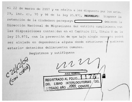 En el caso “F. E.”, el primer movimiento del juzgado frente al pedido de retención de la DNM es el traslado. Cuando lo encontré, estaba cubierto con corrector, pero a trasluz podía leerse el usual “por presentado, por parte […] de la demanda interpuesta, traslado por […] días. Notifíquese”. A continuación de esta enmendadura estaba la sentencia que autorizaba la retención. En el caso “B. F.”, ante otro juzgado, en marzo de 2011 se dio traslado a la persona a expulsar por el plazo de quince días, aunque un mes después fue dejado sin efecto mediante el uso de la siguiente fórmula: “Advirtiendo el tribunal que por un error involuntario se ordenó a hojas [hoja del expediente] correr traslado de la demanda, déjese sin efecto el mismo y pasen los autos a sentencia”.