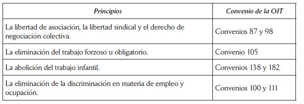 Los antecedentes sobre este asunto se remontan al año 1998, cuando la Organización Internacional del Trabajo (OIT) adoptó la Declaración de los principios y derechos fundamentales de los trabajadores, la cual obliga a todos los Estados miembros que hayan ratificado o no los tratados correspondientes.9 En virtud de lo anterior, el Pacto Mundial recoge los principios emanados de la citada Declaración, materializados en sendos convenios. Los principales convenios de la OIT que regulan su aplicación y cumplimiento son: