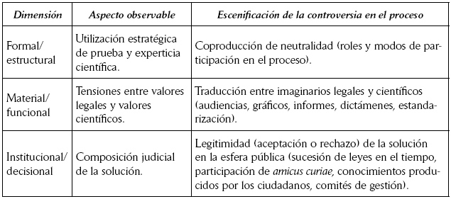 La caracterización de los casos controversiales se efectúa a partir de la construcción de una matriz de análisis organizada en tres dimensiones. En la dimensión formal/estructural, se desarrolla el problema de la utilización de la prueba y la experticia científica en el proceso. En la dimensión material/funcional, se recupera el análisis de las tensiones que se producen en el proceso entre valores propios de las prácticas legales y valores propios de las prácticas tecnocientíficas. Finalmente, en la dimensión institucional/ decisional, se aborda el problema de la posible aceptación o rechazo de la respuesta judicial en relación con otros ámbitos de participación. Estas dimensiones son desarrolladas en los tres siguientes títulos del trabajo, presentándose antes de las conclusiones una tabla que las sintetiza. El diseño de los títulos y subtítulos tiene el propósito de adelantarle al lector la caracterización de los casos controversiales que este trabajo propone.