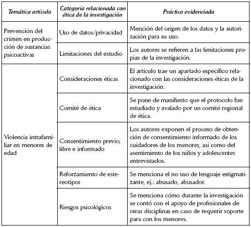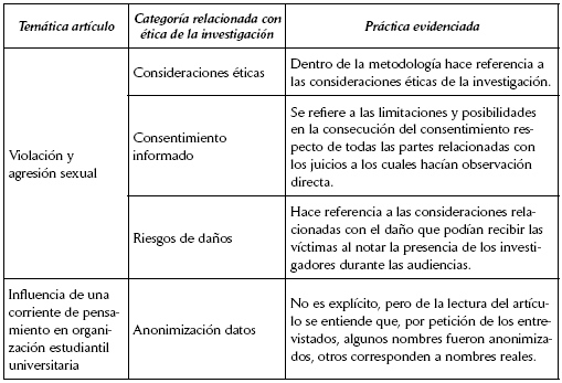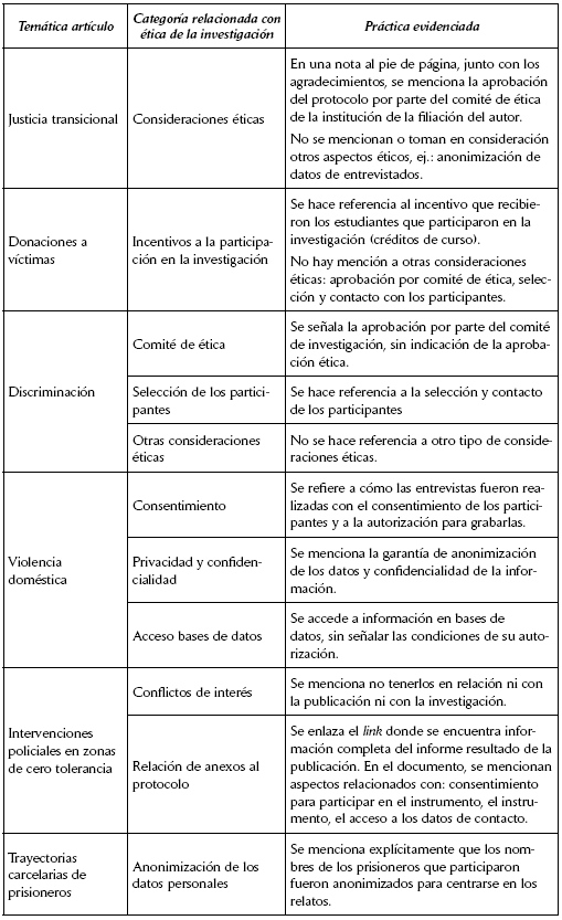 A partir de la literatura revisada, en contraste con los artículos analizados en el campo de la investigación sociojurídica, es importante señalar, en primer lugar, que sí es posible pensar éticamente la investigación sociojurídica, como bien lo hicieron los autores de los artículos analizados, desde la misma formulación de un proyecto de investigación, con el fin de proteger al participante y sus derechos implicados, pues, si bien no existe una normativa que obligue a este campo, desde la perspectiva de las garantías de los derechos fundamentales resulta en una obligación del investigador social.
