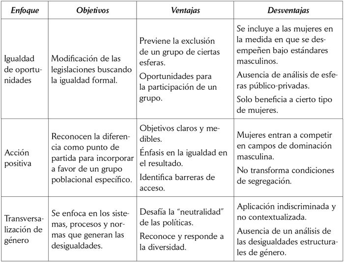 Estos instrumentos contienen diferentes objetivos encaminados a aumentar la participación de las mujeres en todas las esferas de la vida social, y compromete a los Estados a impulsar estrategias para alcanzar dichos objetivos. Sin embargo, dependiendo de contextos específicos, distintos enfoques han sido aplicados para abordar las desigualdades de género. Estos han sido agrupados por la literatura internacional en tres categorías (Rees, 1998; Walby, 2005): (a) igualdad de oportunidades; (b) acción positiva; (c) transversalización de género (ver tabla 1). Los tres enfoques, que hoy en día coexisten, han sido producto de momentos históricos específicos, aunque hay quienes afirman que la transversalización de género es la síntesis de los otros dos (Squires, 2005).