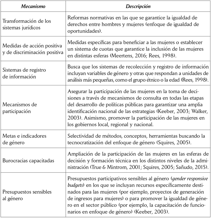 Preocupa entonces que, a pesar de existir una idea generalizada sobre qué es la transversalización de género3, nadie está seguro de qué se requiere para llevarla a la práctica (Beveridge & Nott, 2002). Sin embargo, la literatura internacional ha señalado algunos de los mecanismos que deben incluirse en los diseños de política pública, (ver tabla 2).