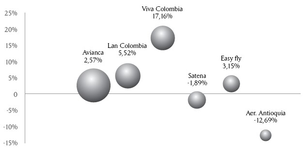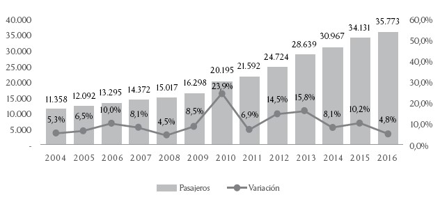 Por su parte, la entrada en operación de aerolíneas de bajo costo en Colombia ha representado un cambio sustancial de modelo de negocio que ha contribuido al incremento del número de pasajeros transportados. Las operaciones de bajo costo en Colombia iniciaron en 2007 con la llegada de Easy Fly, y cobraron especial relevancia a partir de la entrada en el mercado de Viva Air Colombia1 en 2012.2 En 2016, Viva Air Colombia fue la tercera aerolínea con mayor participación en el mercado colombiano, aumentando en un 17 % la cantidad de pasajeros transportados frente al 2015. Easy Fly fue quinta, con un aumento del 3 % frente al 2015. Por su parte, en 2016 entró en operación Wingo, una nueva aerolínea de bajo costo en Colombia que espera ampliar sus operaciones rápidamente (Aeronáutica Civil, 2017).