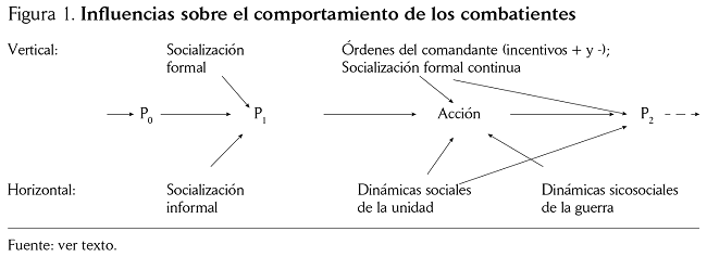 Consecuentemente, para comprender la violencia que los combatientes ejercen en realidad, debemos tener en cuenta las dinámicas sociales de la unidad, así como las instituciones formales de la organización (Figura 1). Las influencias sociales horizontales se muestran en letra cursiva con el fin de resaltar la diferencia entre este modelo y los modelos principal-agente. El recluta entra con un nivel de preferencia por la violación y otros tipos de violencia P0. Inicialmente, con base en la influencia de las instituciones formales de la organización, incluyendo el entrenamiento y la socialización, así como los procesos de socialización informales, dichas preferencias evolucionan a un nivel P1.10 Una vez en el campo, particularmente en el combate, las preferencias del combatiente continúan evolucionando en respuesta a las instituciones formales (incentivos positivos y negativos, así como la socialización formal continua), a los procesos sociales de la unidad, y a los procesos sicosociales de la guerra, al punto P2. Si bien es cierto que no todos los combatientes experimentan transformaciones lo suficientemente profundas como para cambiar sus preferencias, muchos sí lo hacen, especialmente los que han experimentado campañas largas o repetidas.