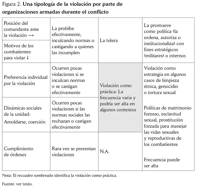 Entonces, ¿en qué condiciones se podrían generar dinámicas sociales que apoyan la violación como práctica frecuente? Primero, las normas y creencias de género, es decir, las masculinidades particulares que producen esas dinámicas en la unidad deben apoyar el ejercicio de la violación como actividad social apoyada por la unidad. En este orden de ideas, es más probable que ocurra la violación como práctica si los combatientes no reciben pago y no pueden realizar sus masculinidades ideales (y la violación como compensación no ha sido institucionalizada por la organización), y si la organización realiza el reclutamiento forzado por medio del secuestro, o si se considera que la pornografía y el sexo violentos son pasatiempos esenciales; además, tiene mayor probabilidad de ocurrir en unidades que no son supervisadas, estacionadas lejos de su base de origen o que han estado en campaña por largos periodos. Se requiere de mayor investigación para identificar otras condiciones que generan dinámicas de unidad que apoyan la violación.