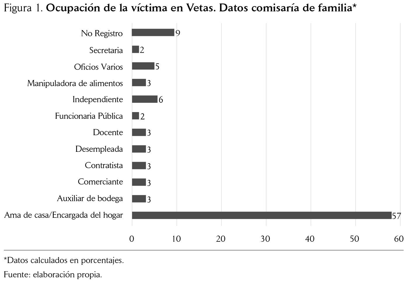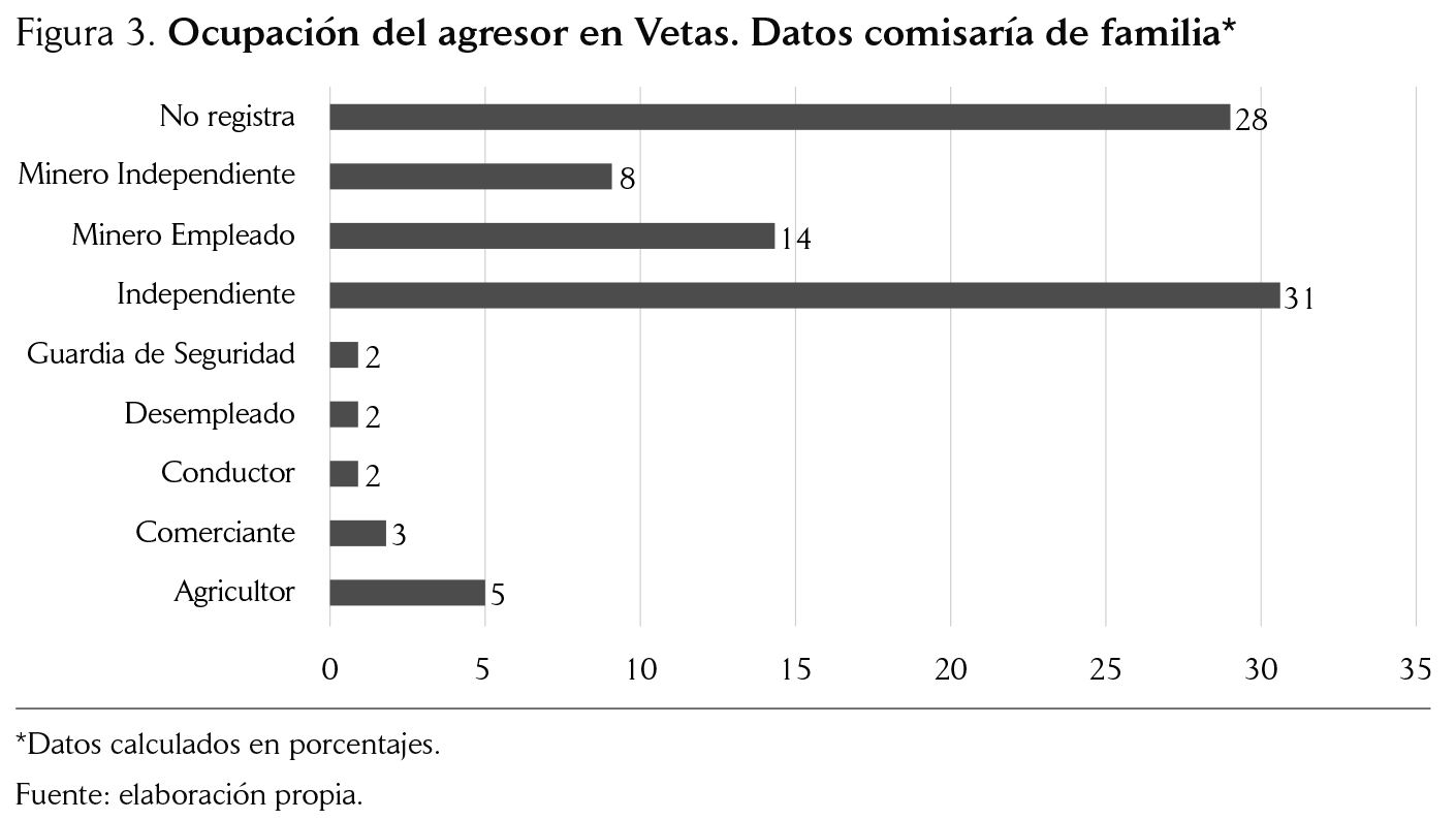 Como zona minera, Santurbán no escapa de esta realidad; una de las entrevistadas menciona que las mujeres suelen asumir tareas relacionadas con el cuidado, la preparación de alimentos para las empresas mineras y la seguridad ocupacional (Participante 2, Comunicación personal, 3 de noviembre de 2017). Esto también queda en evidencia ya que en más del 50% de los casos estudiados de violencia de pareja en esta investigación, la víctima es ama de casa. En este sentido, estudios realizados en Chile dan cuenta de que dicha división sexual del trabajo acentuada por las labores mineras es perpetuada y construida dentro de la familia.