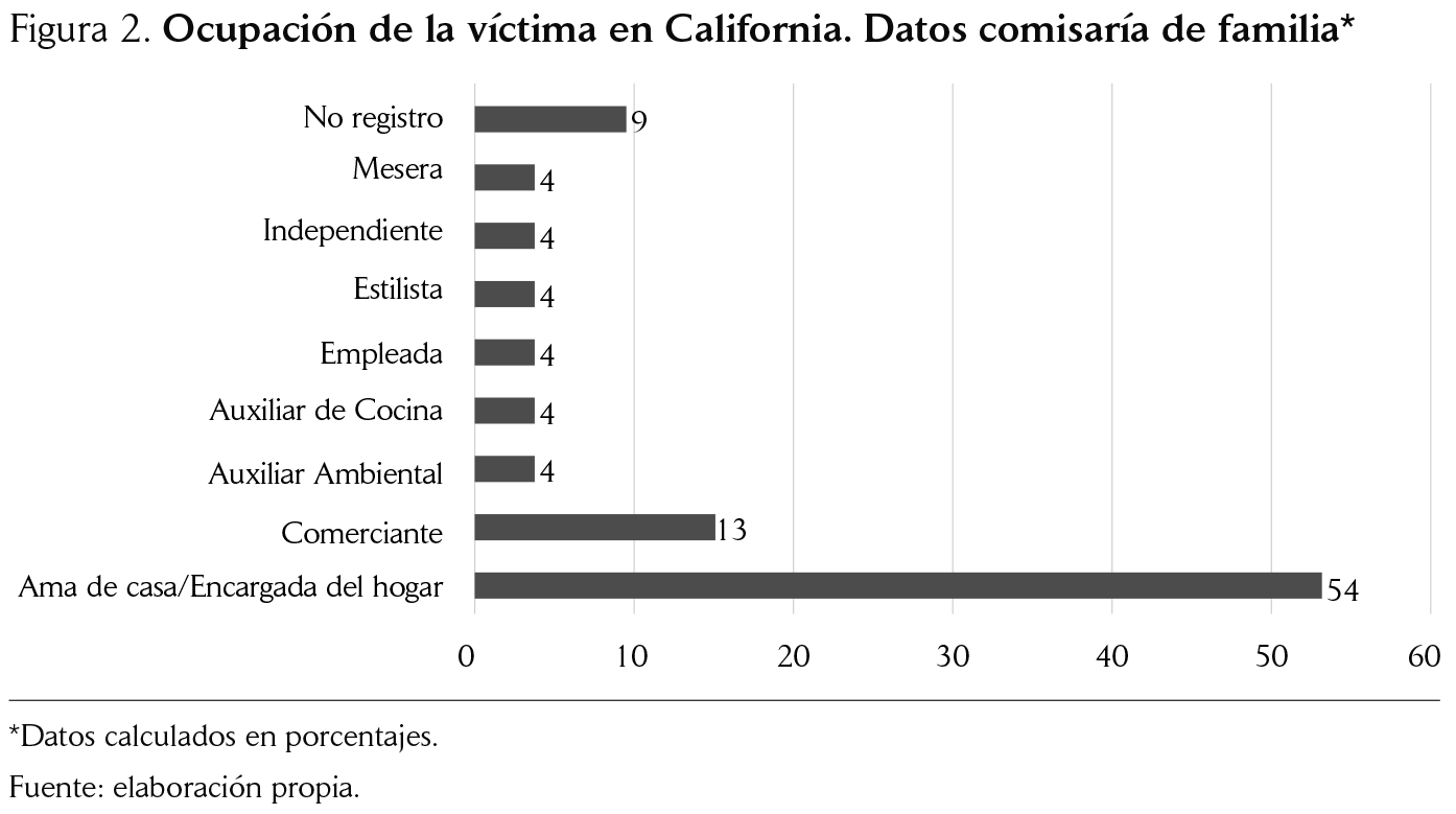 En California y Vetas existe una profunda división sexual del trabajo en las mujeres víctimas de violencia en la relación de pareja y sus agresores. La ocupación de la víctima más referenciada es la de ama de casa tanto en Vetas como en California. Lo anterior se complejiza si, como se ve en este acápite, las mujeres agredidas tienen baja escolaridad, suelen ser menores de 40 años y con hijos menores de edad a su cargo. Este perfil acentúa la dependencia económica de la mujer, lo que, de acuerdo con Amartya Sen (citada por Pineda & Otero, 2004) y a CEPAL, afecta la capacidad de la mujer de terminar con ciclos de violencia de pareja.