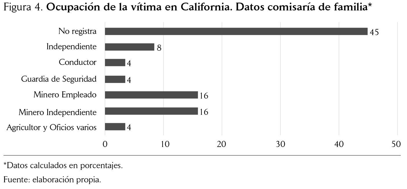 En cuanto a los hombres, si bien la ocupación no es una variable que se referencie de forma habitual por parte de las comisarías de familia, en los casos donde se ha registrado la ocupación del agresor pululan las labores típicamente masculinas, como ser guardia de seguridad, conductor y minero. En cuanto a la variable “independiente”, una de las autoridades entrevistadas mencionó que, por lo general, los casos de violencia que suceden en el municipio hacen referencia a las personas que ejercen la minería por fuera de empresas formalmente constituidas.8 (Participante 3, comunicación Personal, 19 de junio de 2018).