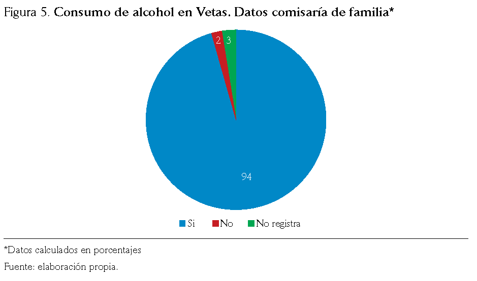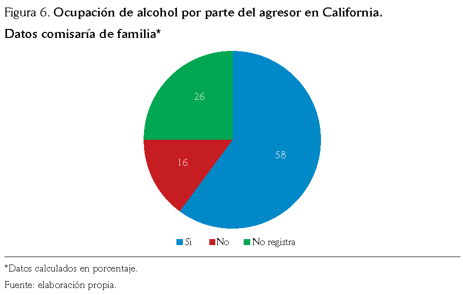 Todos los participantes hicieron referencia al alto consumo de alcohol en el municipio (comunicación personal, 2018). Lo anterior se agrava con el hecho de que un alto porcentaje de casos de violencia en los municipios estudiados se dieron bajo la influencia del alcohol y otras sustancias psicoactivas en el agresor (94 % de los casos en Vetas y 58 % de los casos en California) (Comisaría de Familia de Vetas y California,