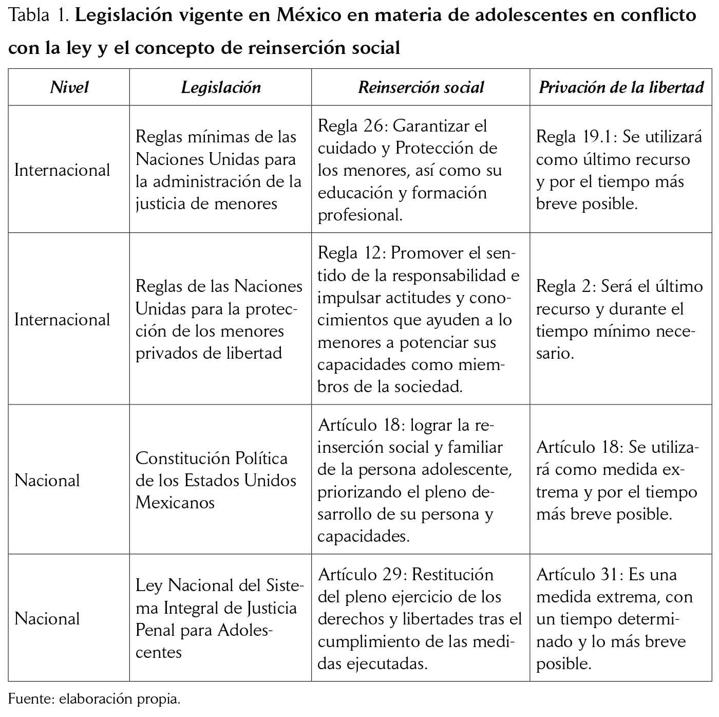 Dentro de la LNSIJPA (2016) se define la reinserción social como “la restitución de pleno ejercicio de los derechos y libertades tras el cumplimiento de las medidas ejecutadas” (art. 29); sin embargo, no va más allá del alcance jurídico y no indica los parámetros que estimarían que un adolescente ha logrado este objetivo. Cabe señalar los requerimientos establecidos por los ordenamientos jurídicos internacionales aplicables a menores de edad en conflicto con la ley en México, algunos de los cuales se enuncian a continuación, ya que brindan una aproximación a lo que es la reinserción social de personas privadas de su libertad y/o dirigidas hacia adolescentes: