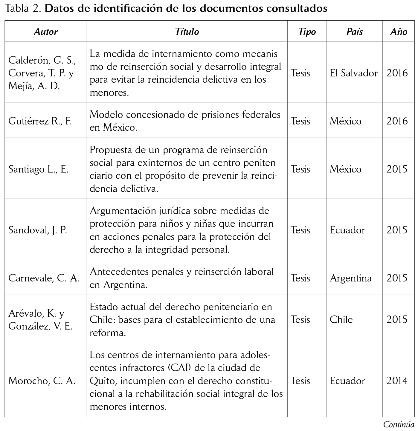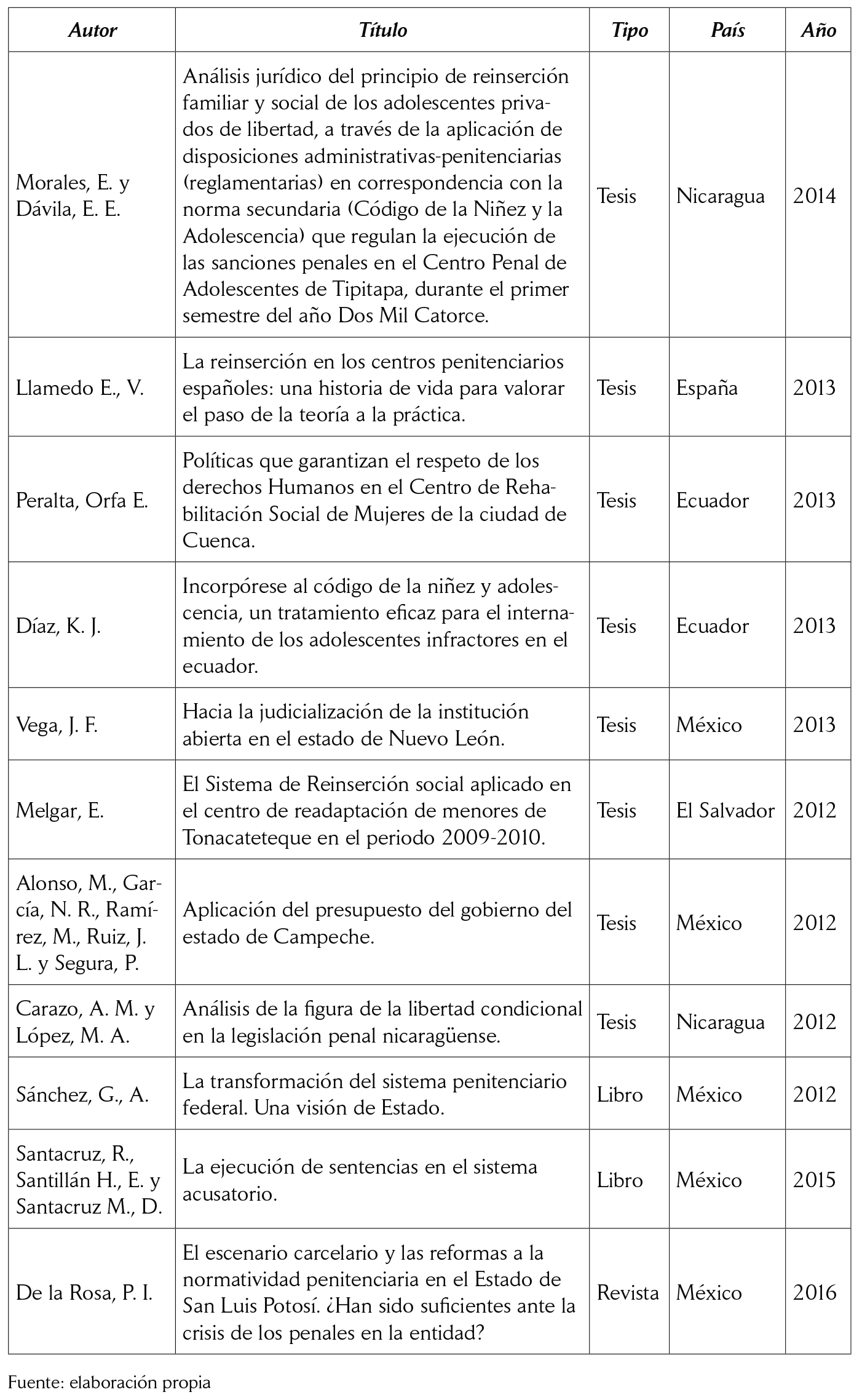 Del total de documentos, únicamente dos tocan el tema de la situación de personas adolescentes y la reinserción social; por su parte, los demás se disponían a describir los elementos que influyen en el proceso para que una persona logre la reinserción una vez que ha egresado de la institución de seguridad y/o haya cumplido con la medida que le fue impuesta. En una de las fuentes se ha encontrado puntualmente una definición particular para la población adolescente, ya que las demás tienden a transcribir o adecuar lo tratado en el concepto que se destina a la población adulta. En la tabla 2 se presentan los datos de identificación de los documentos consultados: seguido del 27,77% para 2015, del 22,22% para 2013 y 2012, y por último del 11,11% para 2014.