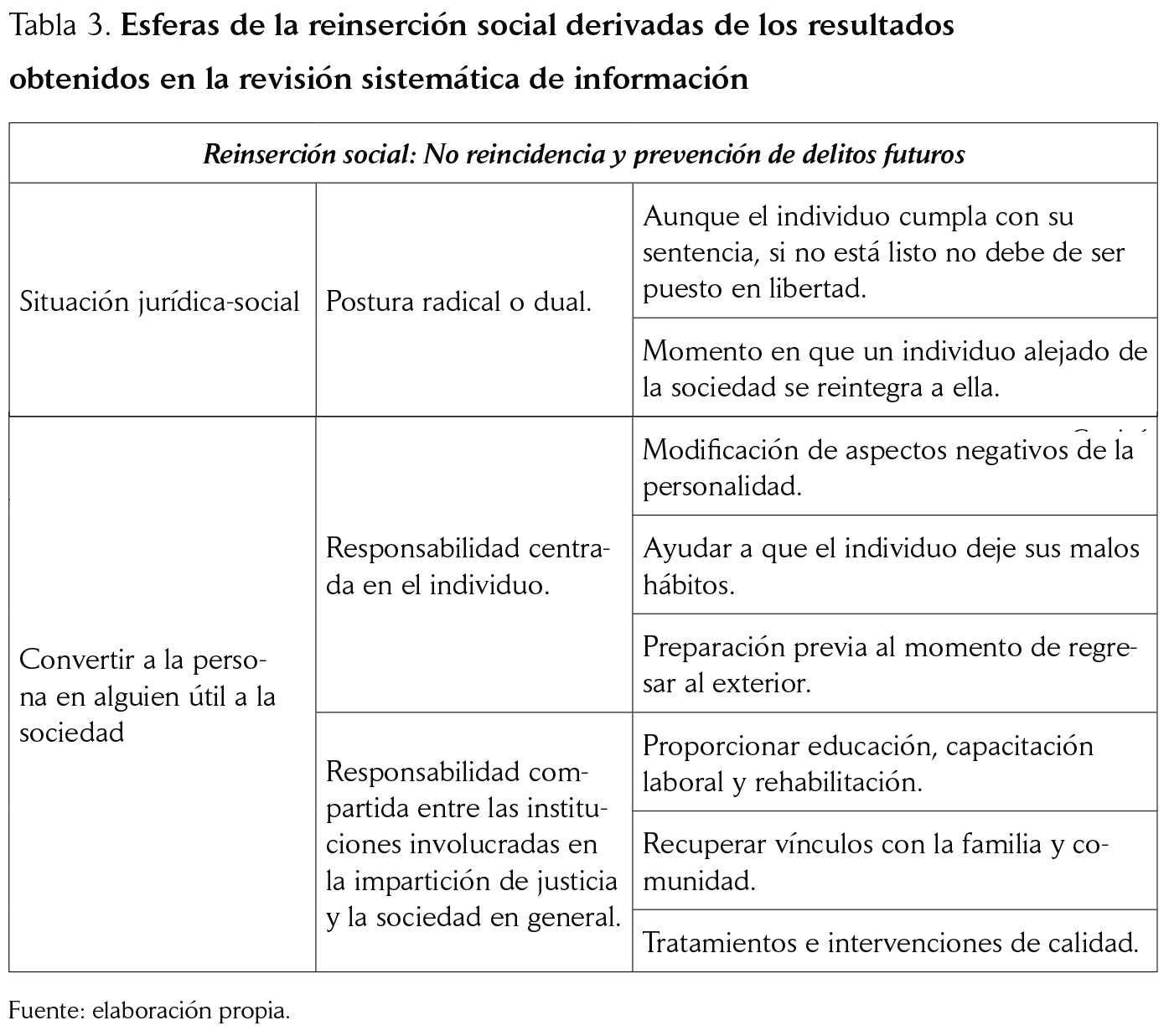 La segunda se refiere a la responsabilidad compartida que existe entre las instituciones involucradas en la impartición de justicia y la sociedad en general, destacando la participación activa de grupos como la familia y la comunidad a la que pertenece el individuo, propiciando su desarrollo bajo intervenciones de calidad en áreas como la educación, la capacitación laboral, entre otros. En la tabla 3 se sintetizan las ideas de los autores, mismas que en el apartado de conclusiones serán discutidas a mayor profundidad.