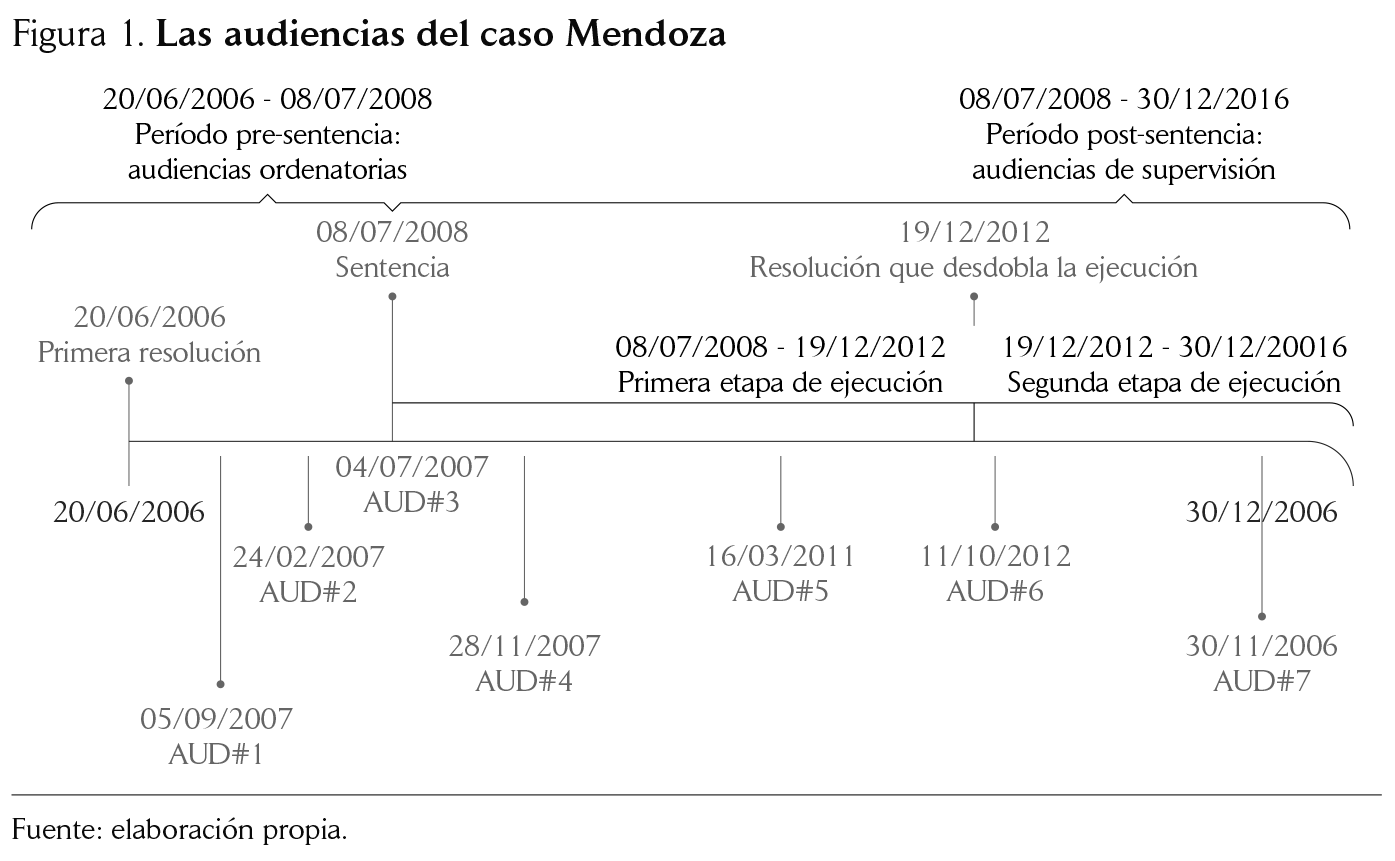 Para ubicar la audiencia que aquí interesa y recorrer algunas de las características particulares del caso, puede esquematizarse su desarrollo en dos grandes etapas (antes y después de la sentencia de 2008), y una segunda dividida a su vez en dos subetapas de la ejecución de la sentencia. La figura 1presenta este esquema ubicando las audiencias públicas celebradas hasta la del 30 de noviembre de 2016 que nos ocupa.