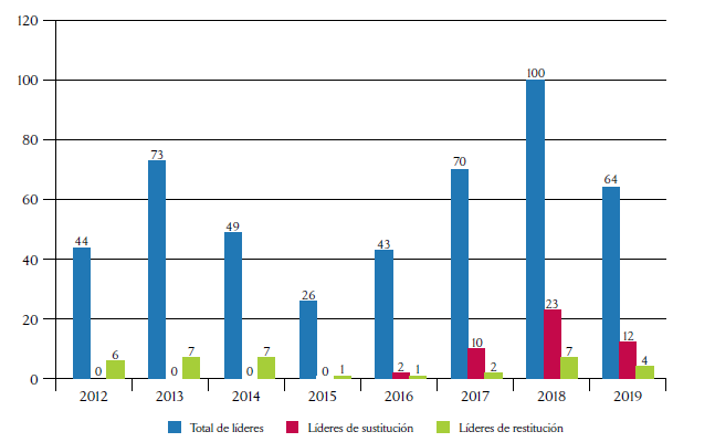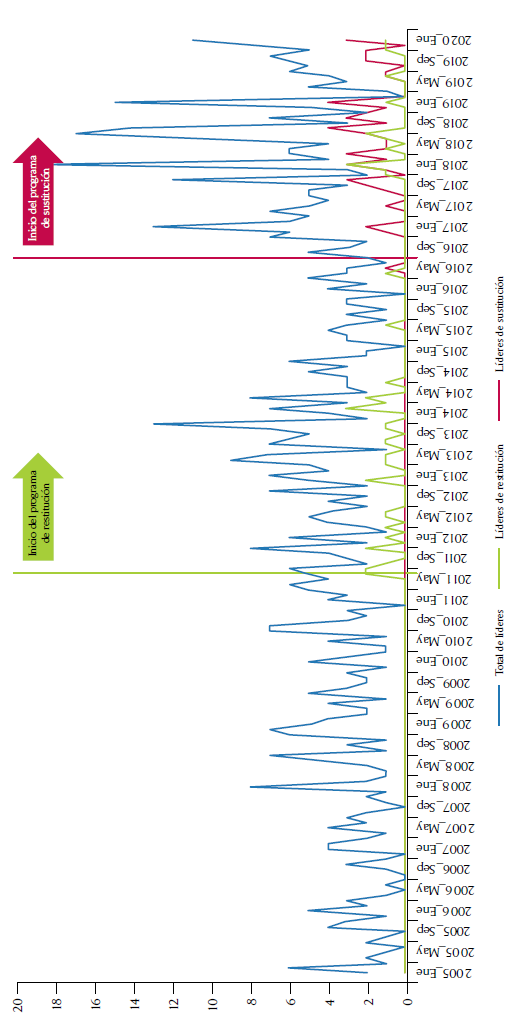 La figura 2 expone igualmente que —aunque los ataques a los líderes de restitución y de sustitución son apenas una fracción de los casos— no son ni de lejos un fenómeno marginal o que pueda ser ignorado. Obviamente, antes de 2016 no podía haber asesinatos de líderes de sustitución. Sin embargo, en los años durante los cuales ambos programas estuvieron activos, las muertes de líderes asociados a ellos acapararon porcentajes bastante altos: el 17 %, 30 % y 21 % de los casos, respectivamente.