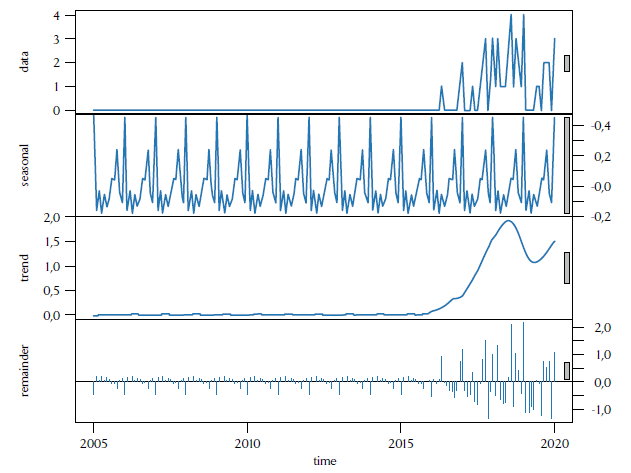 También se pueden considerar las tendencias de la serie. Una vez más, nos concentramos en los resultados, dejando los aspectos técnicos para el anexo. En el caso de la serie sobre victimización de líderes de sustitución, observamos que tiene una tendencia al alza ininterrumpida desde el inicio de la implementación del programa hasta finales de 2018. A partir de este punto presenta una caída durante la primera mitad de 2019, para recuperar su tendencia al alza hasta enero de 2020. La figura 7 ilustra la descomposición de la serie entre sus principales componentes y cómo el asesinato de líderes de sustitución no es coyuntural, sino que expresa una fuerte tendencia creciente. En lo que respecta a la serie de asesinato de líderes de restitución, observamos una tendencia no lineal, que se caracteriza por dos períodos de incremento en la victimización (2011 a 2015 y 2017 a 2018), con posteriores períodos de disminución entre períodos.