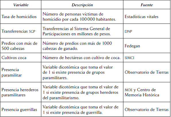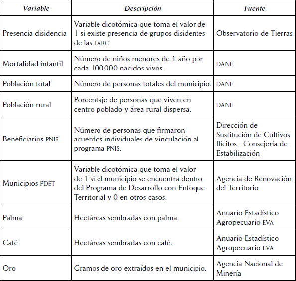 Analizaremos el período de 2016 a 2019, en donde consideramos como variables explicativas las descritas en la tabla 1. En este caso queremos controlar por variables de violencia y desarrollo, además de tener en cuenta el efecto de las políticas desarrolladas en el marco de los acuerdos de paz con las farc y los efectos de otras economías rurales importantes, tales como el café y la minería.