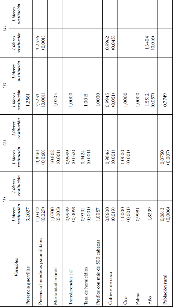 Corrimos una regresión para indagar acerca de las covariables a nivel municipal que podrían estar asociadas al asesinato de líderes. Tanto la descripción de las variables como los detalles técnicos son presentados en el anexo. Nos concentramos aquí en los resultados, sintetizados en cuatro modelos (tabla 1). Para el primer modelo (referido a los líderes de restitución), hallamos que existe una correlación positiva entre la probabilidad de observar victimizaciones y la presencia de herederos de los paramilitares, la mortalidad infantil, la producción de oro, pertenecer al programa pdet, la interacción de la presencia de herederos de los paramilitares y personas en el pnis, y la presencia de herederos paramilitares y las hectáreas cultivadas con coca.6 Específicamente la presencia de herederos del paramilitarismo incrementa en 11,03 veces la probabilidad de ser victimizado y estar en un municipio pdet la acrecienta en 18,12 veces. En el segundo modelo excluimos las variables que no son significativas y observamos que la presencia de herederos del paramilitarismo se correlaciona con un aumento en 13,84 veces la probabilidad de ser victimizado y estar en un municipio pdet con un incremento de 16,46 veces.