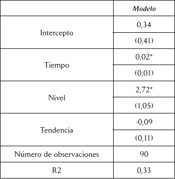 El its consiste en el análisis de los cambios en el nivel (saltos hacia arriba o hacia abajo) y en la tendencia (cambios en la pendiente de la línea de regresión) de un fenómeno cuantificable antes y después de una intervención. En nuestro caso, el fenómeno cuantificable son los ataques letales contra líderes diferentes a los directamente involucrados en el programa. La intervención es el inicio del programa de sustitución. Escogimos la victimización de los directivos de las juntas de acción comunal, pues es la categoría más frecuente en nuestra base. Con todo y las reservas planteadas anteriormente, el resultado —como se observa en la tabla 2— contribuye a la plausibilidad de la afirmación de que la creación de políticas propaz en ausencia de garantías de seguridad aumentó el riesgo de otros líderes, aparte de las categorías directamente implicadas. Como se ve, tanto la tendencia previa a la intervención como el salto en el nivel son estadísticamente significativos. Según la primera, por cada semana adicional asesinaban a un comunal adicional. De acuerdo con la segunda, la intervención implicó un salto hacia arriba de entre 2 y 3 víctimas en el bimestre siguiente a la intervención.