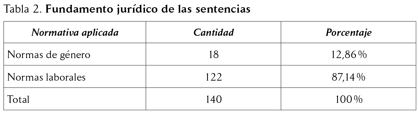 Además, es posible clasificar las sentencias según la normativa en que se fundan (tabla 2). Así, la mayor parte de los pronunciamientos utiliza las prescripciones de la normativa laboral argentina12 antes que la normativa específica sobre protección a las mujeres.13 Las disposiciones del derecho laboral que se aplican tienen que ver con la responsabilidad del empleador por el daño sufrido por las trabajadoras en el ámbito laboral, en vinculación con el deber de indemnidad que pesa sobre aquel. De tal modo, las normas más citadas son el deber de seguridad del artículo 75 de la LCT14 y el artículo 4.1. de la Ley de Riesgos del Trabajo (24.557)15 que, en muchos casos, son complementadas con la responsabilidad objetiva de los artículos 1753 y siguientes del Código Civil y Comercial de la Nación Argentina (CCYCN).16