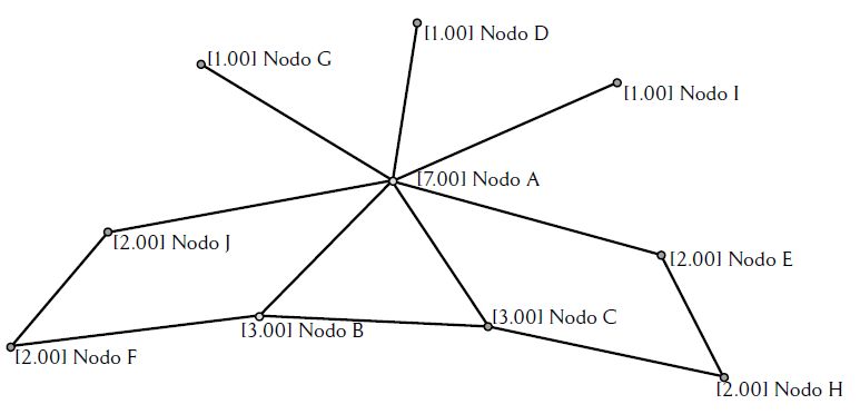 Arjona Sánchez (2010) identifica una preocupación común en varios textos que combinan derecho y redes, que gira en torno al problema de la centralidad, 4 que en la TdR es la información respecto a la importancia relativa de los nodos de un gráfico, de forma tal que puede medirse la centralidad de un elemento en una red que en principio no tenía un centro previamente definido. Así, en aquellos casos en donde la relación entre normas o conjuntos de normas no puede ser fácilmente explicada en la lógica de la piramide kelseniana, preguntarse por la centralidad permitiría entender la lógica del ordenamiento jurídico contemporáneo, debido a que unos nodos serán más visitados que otros en la topología de una determinada red jurídica; es decir, no se ubica la cúspide de una piramide sino unos nodos en donde la aglutinación muestra mayor relevancia. Por ejemplo, en la figura 2, se puede observar la centralidad del nodo A, que tiene siete conexiones con los otros nodos.