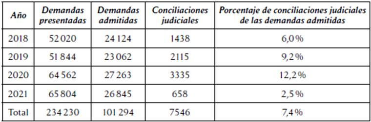 De esta información se puede concluir que, del total de demandas presentadas, solo un 43 % son finalmente admitidas, de las cuales únicamente el 7,4 % culmina con acuerdos resultado de conciliaciones judiciales.