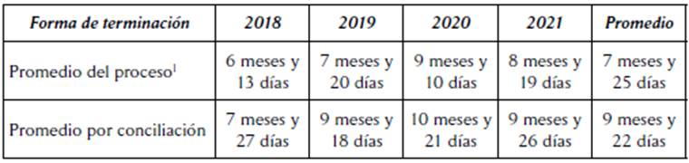 Finalmente, en cuanto a la duración promedio de un proceso que culmine en sentencia y los que se finalizaron mediante acuerdo conciliatorio para los años 2018, 2019, 2020 y 2021, se obtuvo la información de la tabla 3.