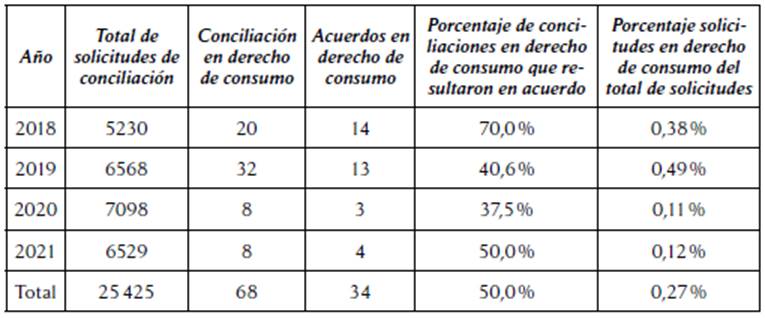 Sin embargo, en los centros de conciliación privados los costos de entrada de sus servicios no son gratuitos. Este es el caso de la Cámara de Comercio de Bogotá, que tiene un marco tarifario para el trámite conciliatorio que varía según la cuantía del conflicto. Es importante resaltar que son muy pocos los casos en materia de consumo que se resuelven en esta entidad. De la información que se recolectó, se encontró que para los años 2018, 2019, 2020 y 2021 hubo un total de 25 425 de solicitudes de conciliación en la Cámara de Comercio de Bogotá, de las cuales solo 68 versaron sobre derechos de los consumidores, lo que equivale a un 0,27 % del total.