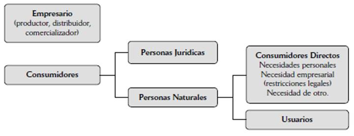 De la misma definición que nos da la ley, se observa la diferencia que existe entre el empresario y el consumidor, pero, más aún, existe diferencia entre los mismos consumidores, los que, conforme con la ley, pueden ser personas naturales o personas jurídicas; así mismo, la personas naturales pueden ser consumidores directos que compran un producto para satisfacer una necesidad propia, pero también pueden comprarlo para llenar una necesidad de su empresa (con las condiciones que establece la ley), así como también puede ser la compra de un regalo para sus hijos, un juguete, un celular, un videojuego, etc., producto que usará un menor de edad, el que, según la definición de consumidor que nos da la ley, por ser usuario del producto el ordenamiento lo ve y lo protege como consumidor (Vega Mere, 2001, p. 605).