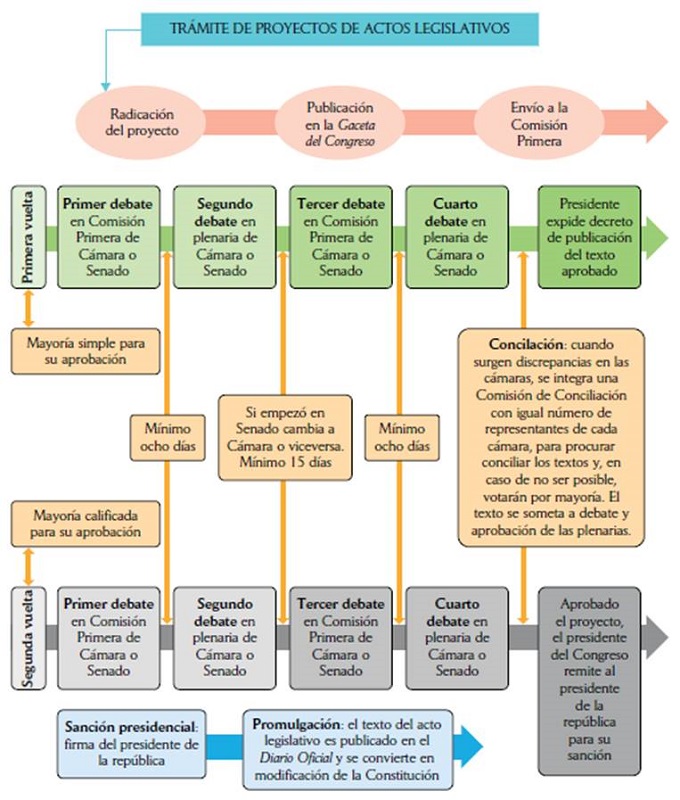 Por lo tanto, un acto legislativo, en su proceso de formación y de acuerdo con el reglamento del Congreso, debe, primero, presentarse ante la Secretaría General de una de las cámaras o en sus plenarias, bien sea por solicitud del gobierno nacional, por diez miembros del Congreso, por un número de ciudadanos igual o superior al 5 % del censo electoral existente en la fecha respectiva, o por un 20 % de los concejales o diputados del país; segundo, deberá tramitarse en dos períodos ordinarios y consecutivos, no necesariamente dentro de la misma legislatura; y tercero, para su aprobación se requeriría de ocho debates, cuatro en primera vuelta, que deben ser aprobados por cada una de las cámaras por mayoría simple y publicados por el gobierno; y los otros cuatro debates, en segunda vuelta, en los que se requeriría de mayoría absoluta para su aprobación. Así mismo, es claro que en la segunda vuelta no se podrán discutir temas que fueron rechazados o no incluidos en la primera, siendo aplicable a este trámite lo dispuesto para las leyes ordinarias, siempre y cuando no sean incompatibles (Ley 5 de 1992, arts. 221 y ss.), lo que se puede resumir en el flujograma de la figura 1.