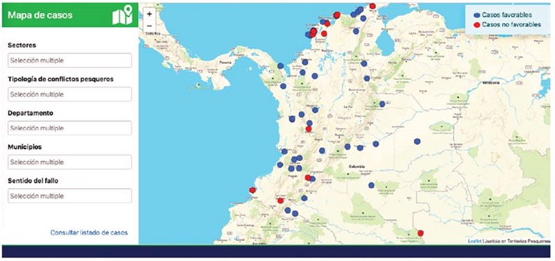 Con fines comparativos unificamos el lenguaje de las sentencias siguiendo los términos comúnmente utilizados en el derecho internacional de los derechos humanos.2 Nuestro análisis llevó a la construcción de la página web Justicia en Territorios Pesqueros (http://pescayjusticia.unimagdalena.edu.co/), que busca visibilizar y promover el análisis de casos relacionados con violaciones de derechos humanos en la pesca artesanal en Colombia. Esta herramienta cuenta con un mapa interactivo que permite rescatar las variables de información identificadas en las sentencias por medio de filtros (figura 1). Nuestro objetivo es ir enriqueciendo y actualizando esta base de datos, y buscar oportunidades para ampliar y profundizar el análisis de violaciones de derechos humanos en territorios pesqueros artesanales.