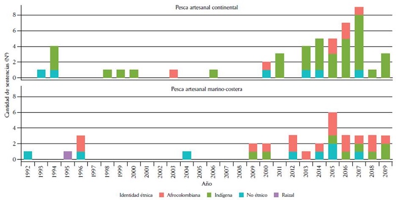 Durante este último período la autoridad pesquera pasó del Instituto Colombiano de Desarrollo Rural (Incoder 2009-2011) a la Autoridad Nacional de Acuicultura y Pesca (Aunap) en 2011. Entre 2018 y 2019 el número de casos disminuyó de un máximo de 12 en 2017 a 5 en 2019. Los procesos jurídicos analizados tuvieron una duración promedio de dos años, con una duración mínima de 74 días (T-605/1992: desplazamiento de sitios de desembarcos de la comunidad de pescadores de Mendihuaca en el Magdalena, fallo favorable) y una duración máxima de 25 años en (T-080/2015: derrame químico de planta de poliestireno en Bolívar, fallo favorable).