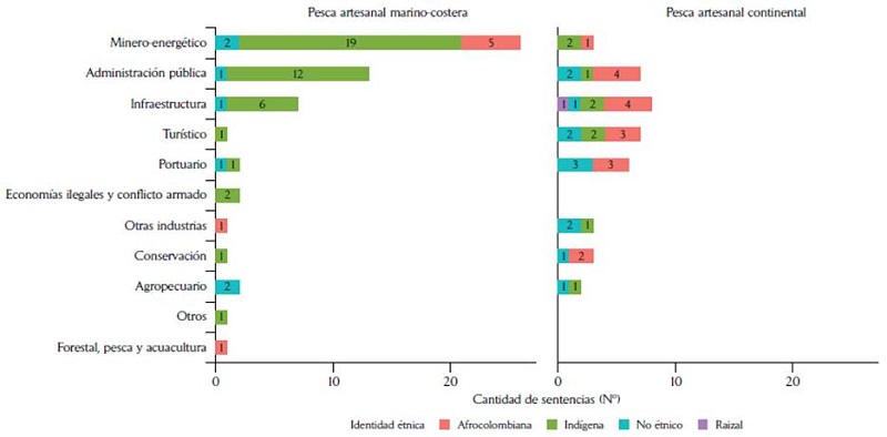La información de las sentencias también permitió relacionar cada caso con sectores económicos: minero-energético (27), administración pública (20), infraestructura (13), portuario (8), turístico (7), otras industrias (4), agropecuario (4), economías ilegales y conflicto armado (2) y forestal, pesca y acuicultura (1) (figura 3). Ocho sentencias se encuentran asociadas a dos o tres sectores al mismo tiempo. Se evidencia que los sectores minero-energético, de administración pública y de infraestructura son los más vinculados con violaciones de derechos humanos de comunidades pesqueras artesanales continentales, mientras que los sectores de infraestructura, turismo y administración pública se encuentran más asociados a casos de pesca artesanal marino-costera. La relación que existe entre el tipo de pesca, grupos étnicos y sectores económicos está alineada con los sectores que históricamente han sido priorizados como ejes centrales de desarrollo económico nacional (ver Mejía et al., 2020). De igual forma, se evidencian las falencias de la administración pública en su deber de garantizar la protección de los derechos de las comunidades pesqueras artesanales en el país.