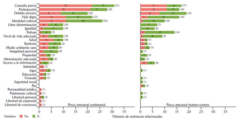 ABSTRACT: The seas and inland waters have historically been spaces of the invisibleness of social struggles. This article offers an interdisciplinary analysis of the Colombian Constitutional Court decisions related to human rights violations in artisanal fisheries territories. We used a human rights-based approach to study 79 court proceedings and built a digital database called Justice in Fishing Territories (Justicia en Territorios Pesqueros). We identified and analyzed the most frequently claimed and protected rights. Most of the Court proceedings are centered on participation processes, indicating that artisanal fisheries sector actors are not being considered in the approval of development projects. We conclude that the Colombian State privileges the interests of the industrial economic sector to the detriment of the rights of the fishing populations.