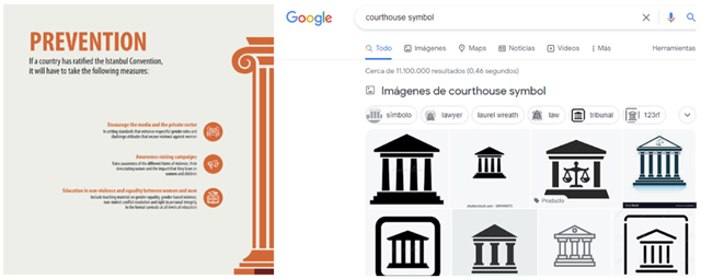 También los materiales diseñados para difundir el contenido de las convenciones giran en torno a un núcleo jurídico-penal. Por ejemplo, el folleto "The Four Pillars of the Istanbul Convention" (2021) [Los cuatro pilares del Convenio de Estambul], que resume los puntos clave del instrumento y se ha difundido ampliamente, emplea artes gráficas basadas en pilares greco-romanos (véase figura 1) en todas sus páginas. Los pilares son un elemento de la arquitectura clásica comúnmente usado para simbolizar un juzgado. En este caso, aparecen incluso en las secciones que no se refieren al proceso judicial, colocando a todo el paradigma, visualmente, bajo la autoridad jurídica.